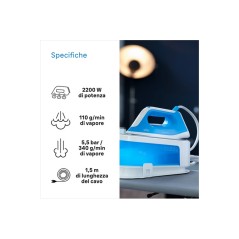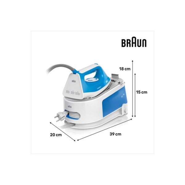 Braun CareStyle 1 SISTEMA STIRANTE IS1012BL. Potenza ferro: 2400 W, Emissione concentrata vapore: 340 g/min, Materiale piastra: Piastra in Ceramica. Materiale manico: Plastica. Larghezza: 200 mm, Profondità: 390 mm, Altezza: 180 mm. Durata della garanzia: 2 anno/i. Larghezza imballo: 227 mm, Profondità imballo: 385 mm, Altezza imballo: 294 mm