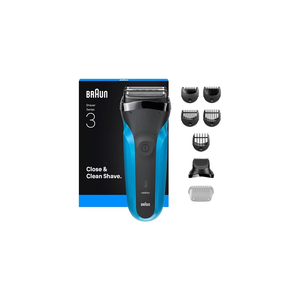 Braun Series 3 310BT. Sistema di rasatura: Rasoio, Colore del prodotto: Nero, Blu. Alimentazione: Batteria, Tecnologia batteria: Nichel-Metallo Idruro (NiMH), Tipo batteria: Batteria integrata. Larghezza: 57 mm, Profondità: 156 mm, Altezza: 48 mm. Quantità per pacco: 1 pz, Pettini: Barba, Testa