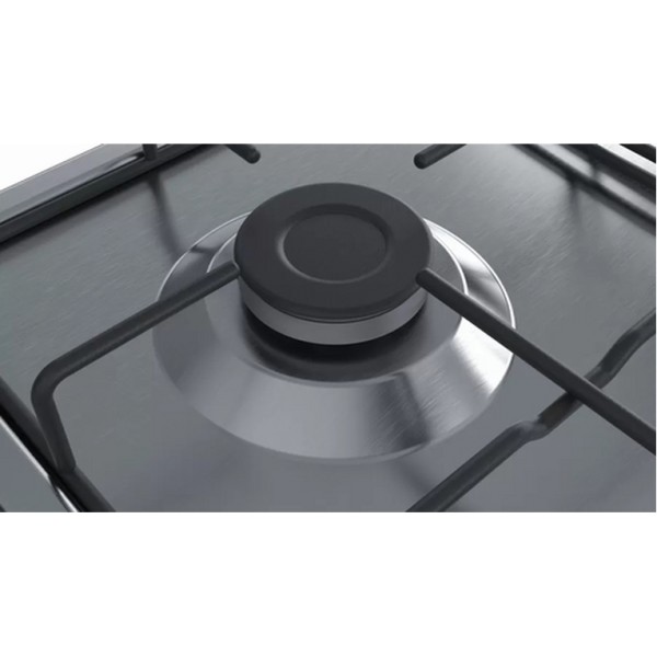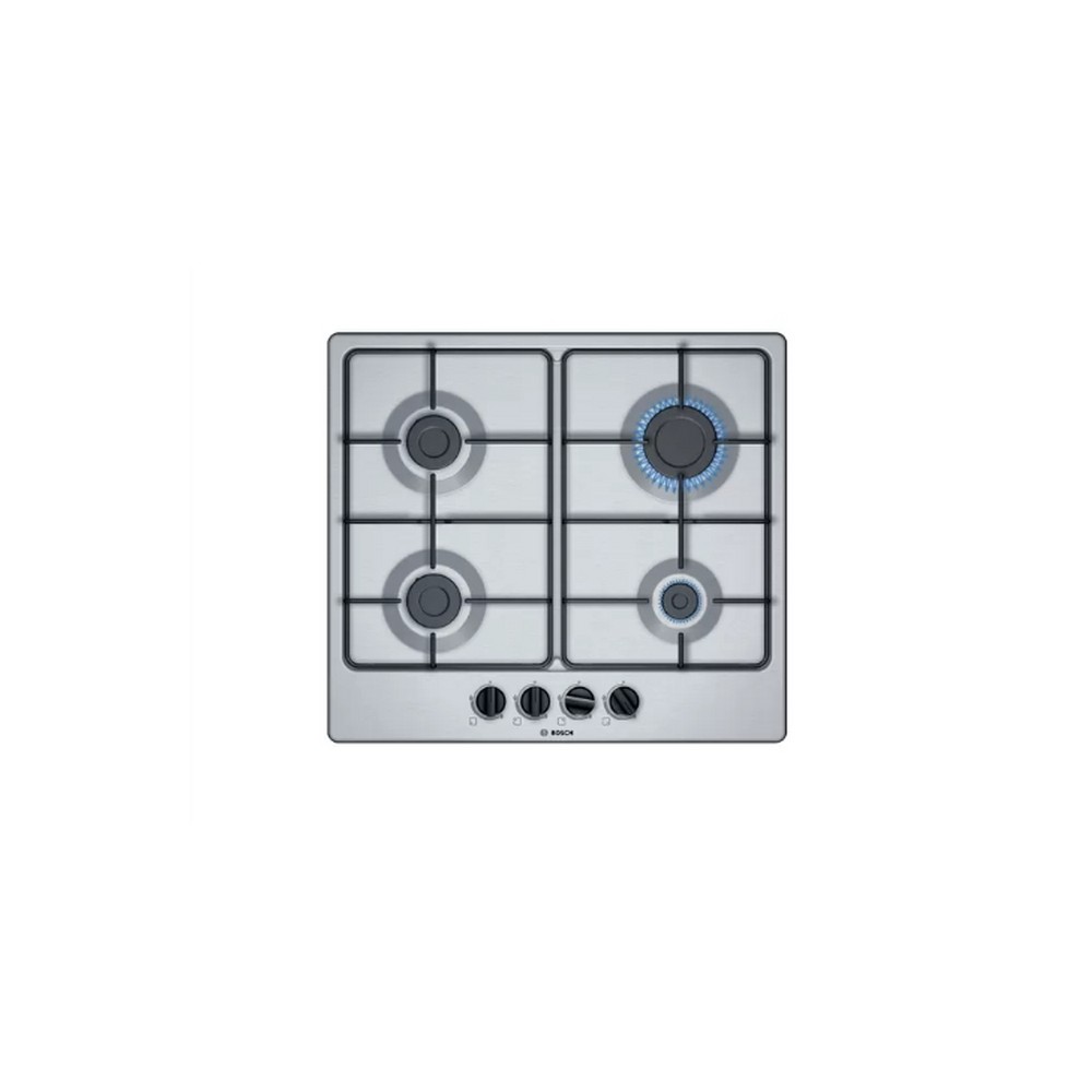 Bosch Serie 4 PGP6B5B86. Colore del prodotto: Acciaio inox, Posizionamento dell'apparecchio: Da incasso, Dimensione della larghezza del piano cottura: 60 cm. Bruciatore piccolo: 1000 W, Bruciatore medio: 1750 W, Bruciatore grande: 3000 W. Tipo di controllo: Manopola, Posizione di controllo: Frontale. Potenza aggregata (gas): 7500 W, Tensione di ingresso AC: 220-240 V, Frequenza di ingresso AC: 50-60 Hz. Larghezza: 582 mm, Profondità: 520 mm, Altezza: 53 mm
