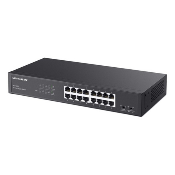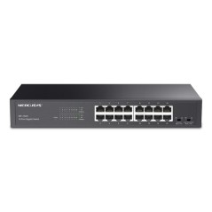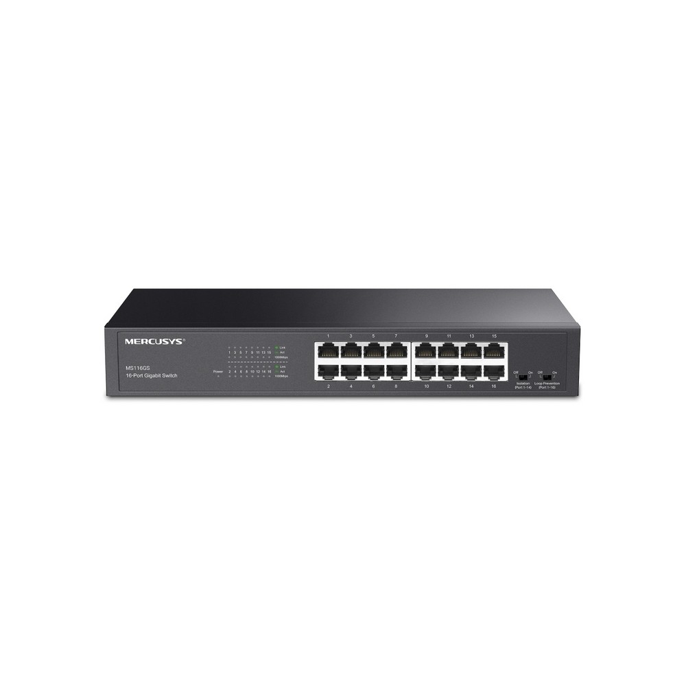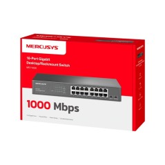 Mercusys MS116GS. Tipo di porte RJ-45: Gigabit Ethernet (10/100/1000), Quantità di porte RJ-45: 16. Dimensioni tavola MAC: 8000 voci, Capacità di commutazione: 32 Gbit/s. Standard di rete: IEEE 802.1p, IEEE 802.3ab, IEEE 802.3i, IEEE 802.3u, IEEE 802.3x. Montaggio rack