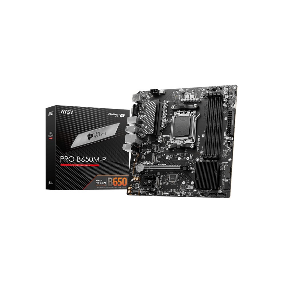 MSI PRO B650M-P. Produttore processore: AMD, Presa per processore: Socket AM5, Processori compatibili: AMD Ryzen 7 7th Gen, AMD Ryzen 9 7th Gen. Tipi di memoria supportati: DDR5-SDRAM, RAM massima supportata: 192 GB, Velocità di memoria supportate: 6000, 5800, 5600, 5400, 5200, 5000, 4800 MHz. Interfacce dell'unità di archiviazione supportate: M.2, SATA, Livelli RAID: 0, 1, 10. Tipo di interfaccia Ethernet: 2.5 Gigabit Ethernet, Controller LAN: Realtek RTL8125-BG. Componente per: PC, Fattore di forma scheda madre: micro ATX, Famiglia di chipset per scheda madre: AMD