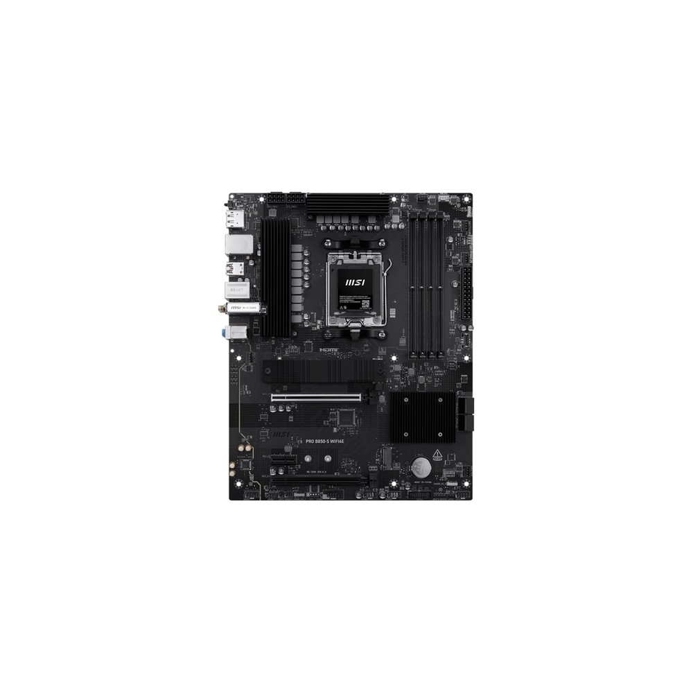 MSI PRO B850-S WIFI6E. Produttore processore: AMD, Presa per processore: Socket AM5, Processori compatibili: AMD Ryzen 7000 Series, AMD Ryzen 8000 Series, AMD Ryzen 9000 Series. Tipi di memoria supportati: DDR5-SDRAM, RAM massima supportata: 256 GB, tipo di slot di memoria: DIMM. Interfacce dell'unità di archiviazione supportate: M.2, SATA, Tipi di unità di archiviazione supportate: HDD & SSD, Livelli RAID: 0, 1, 10. Tipo di interfaccia Ethernet: 2.5 Gigabit Ethernet, Controller LAN: Realtek RTL8125, Wi-Fi standard: Wi-Fi 6E (802.11ax). Componente per: PC, Fattore di forma scheda madre: ATX, Famiglia di chipset per scheda madre: AMD