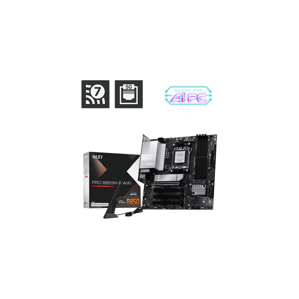 MSI PRO B850M-P WIFI. Produttore processore: AMD, Presa per processore: Socket AM5, Processori compatibili: AMD Ryzen 7000 Series, AMD Ryzen 8000 Series, AMD Ryzen 9000 Series. Tipi di memoria supportati: DDR5-SDRAM, RAM massima supportata: 256 GB, tipo di slot di memoria: DIMM. Interfacce dell'unità di archiviazione supportate: M.2, Tipi di unità di archiviazione supportate: HDD & SSD, Livelli RAID: 0, 1, 10. Tipo di interfaccia Ethernet: 5 Gigabit Ethernet, Wi-Fi standard: Wi-Fi 7 (802.11be), Standard Wi-Fi: 802.11a, 802.11b, 802.11g, Wi-Fi 4 (802.11n), Wi-Fi 5 (802.11ac), Wi-Fi 6 (802.11ax), Wi-Fi 6E.... Componente per: PC, Fattore di forma scheda madre: micro ATX, Famiglia di chipset per scheda madre: AMD