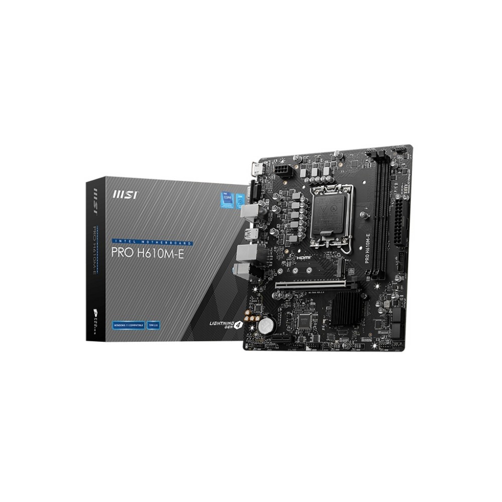 MSI PRO H610M-E. Produttore processore: Intel, Presa per processore: LGA 1700, Processori compatibili: Intel® Celeron®, Intel® Core™ i3, Intel® Core™ i5, Intel® Core™ i7, Intel® Core™ i9,.... Tipi di memoria supportati: DDR5-SDRAM, RAM massima supportata: 96 GB, tipo di slot di memoria: DIMM. Interfacce dell'unità di archiviazione supportate: M.2, SATA III, Tipi di unità di archiviazione supportate: HDD & SSD, Livelli RAID: 0, 1, 5, 10. Tipo di interfaccia Ethernet: 2.5 Gigabit Ethernet. Componente per: PC, Fattore di forma scheda madre: micro ATX, Famiglia di chipset per scheda madre: Intel
