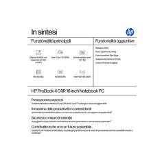 HP ProBook 4 G1iR. Tipo di prodotto: Computer portatile, Fattore di forma: Clamshell. Famiglia processore: Intel® Core™ i5, Modello del processore: i5-1334U. Dimensioni diagonale schermo: 40,6 cm (16"), Tipologia HD: WUXGA, Risoluzione del display: 1920 x 1200 Pixel. RAM installata: 16 GB, Tipo di RAM: DDR5-SDRAM. Capacità totale di archiviazione: 512 GB, Supporto di memoria: SSD. Modello scheda grafica integrata: Intel Iris Xe Graphics. Sistema operativo incluso: Windows 11 Pro. Colore del prodotto: Argento. Peso: 1,74 kg
