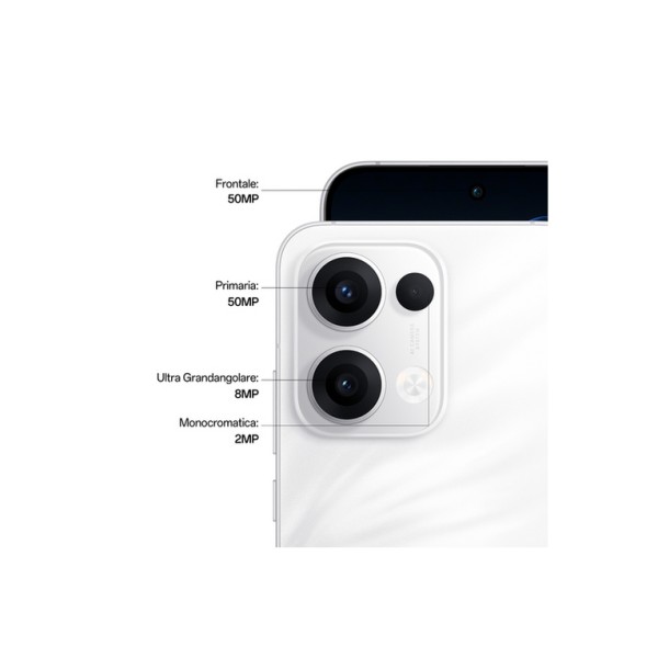 OPPO Reno13 5G AI Smartphone, Tripla fotocamera 50+8+2MP, Selfie 50MP, Display 6.59” 120HZ AMOLED FHD+, 5600mAh, RAM 12GB(Esp4GB/8GB/12GB)+ROM 256GB, [Versione Italia], Plume White. Dimensioni diagonale schermo: 16,7 cm (6.59"), Risoluzione del display: 2760 x 1256 Pixel. Famiglia processore: MediaTek Dimensity. Capacità della RAM: 12 GB, Tipo di RAM: LPDDR5X, Capacità memoria interna: 256 GB. Risoluzione fotocamera posteriore (numerico): 50 MP, Tipo di fotocamera posteriore: Tripla fotocamera. Capacità della scheda SIM: Doppia SIM. Sistema operativo incluso: Android 15. Capacità della batteria: 5600 mAh. Colore del prodotto: Bianco. Peso: 181 g