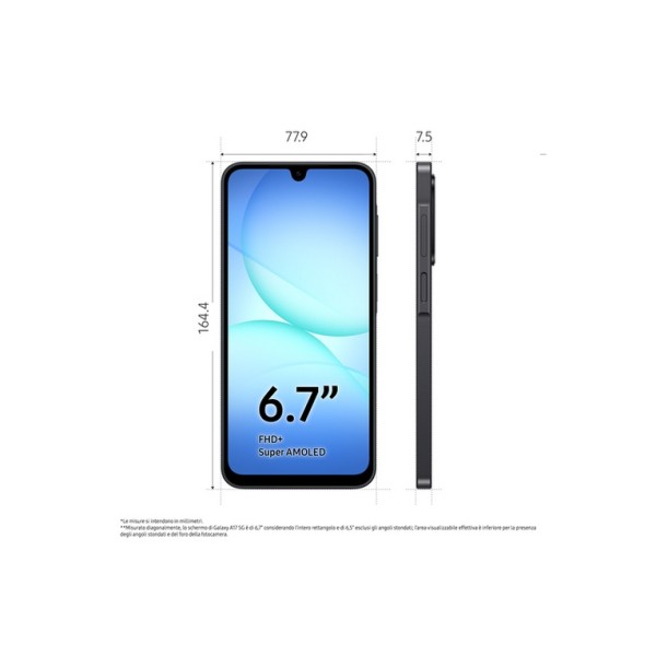 Samsung Galaxy A17 5G, Android 15, Display sAMOLED 6.7", 8GB RAM, 256GB, Batteria 5.000 mAh, Resistenza IP54, Memoria espandibile fino a 2TB, Black. Dimensioni diagonale schermo: 17 cm (6.7"), Risoluzione del display: 1080 x 2340 Pixel. Capacità della RAM: 8 GB, Capacità memoria interna: 256 GB. Risoluzione fotocamera posteriore (numerico): 50 MP, Tipo di fotocamera posteriore: Tripla fotocamera. Capacità della scheda SIM: Dual SIM ibrida. Capacità della batteria: 5000 mAh. Colore del prodotto: Nero. Peso: 192 g