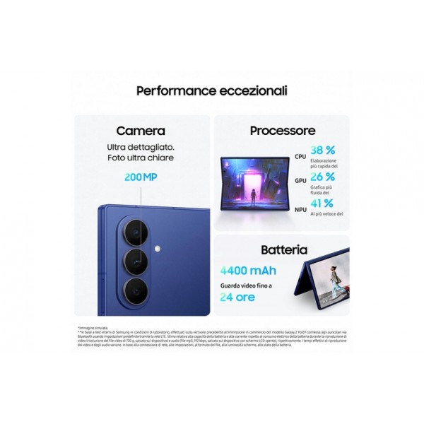 Samsung Galaxy Z Fold7 Smartphone AI, RAM 12GB, 512GB, Display 6,5"/8", Camera 200MP, Batteria a lunga durata, Jetblack. Dimensioni diagonale schermo: 20,3 cm (8"), Risoluzione del display: 2184 x 1968 Pixel. Famiglia processore: Qualcomm Snapdragon, Modello del processore: 8 Gen 3. Capacità della RAM: 12 GB, Capacità memoria interna: 512 GB. Risoluzione fotocamera posteriore (numerico): 200 MP, Tipo di fotocamera posteriore: Tripla fotocamera. Sistema operativo incluso: Android 16.0. Capacità della batteria: 4400 mAh. Colore del prodotto: Nero. Peso: 215 g
