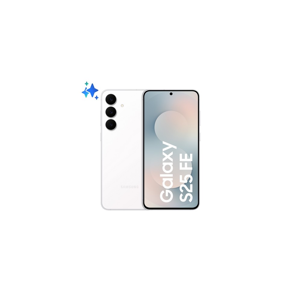 Samsung Galaxy S25 FE, Smartphone AI, Display Dynamic AMOLED 2X 6.7'', Fotocamera 50MP, 8GB RAM, 256GB, Batteria 4.900 mAh, White. Dimensioni diagonale schermo: 17 cm (6.7"), Risoluzione del display: 1080 x 2340 Pixel. Famiglia processore: Samsung Exynos, Modello del processore: 2400. Capacità della RAM: 8 GB, Capacità memoria interna: 256 GB. Risoluzione fotocamera posteriore (numerico): 50 MP, Tipo di fotocamera posteriore: Tripla fotocamera. Capacità della scheda SIM: Doppia SIM. Capacità della batteria: 4900 mAh. Colore del prodotto: Bianco. Peso: 190 g