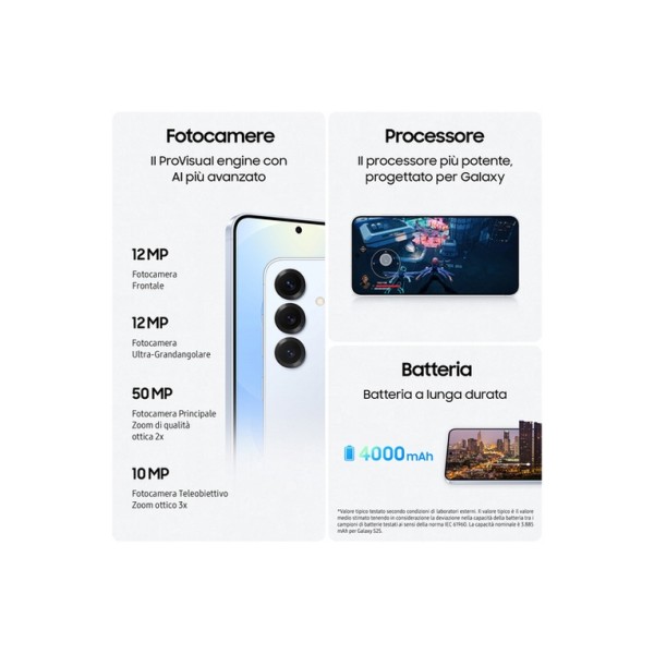Samsung Galaxy S25 Smartphone AI, Display 6.2'' FHD+ Dynamic AMOLED 2X, Fotocamera 50MP, RAM 12GB, 256GB, 4.000 mAh, Navy. Dimensioni diagonale schermo: 15,8 cm (6.2"), Risoluzione del display: 2340 x 1080 Pixel. Famiglia processore: Snapdragon, Modello del processore: 8 Elite. Capacità della RAM: 12 GB, Capacità memoria interna: 256 GB. Risoluzione fotocamera posteriore (numerico): 50 MP, Tipo di fotocamera posteriore: Tripla fotocamera. Capacità della scheda SIM: Doppia SIM. Sistema operativo incluso: Android 15. Capacità della batteria: 4000 mAh. Colore del prodotto: Blu marino. Peso: 162 g