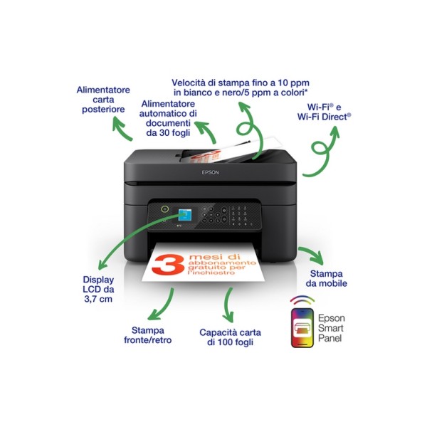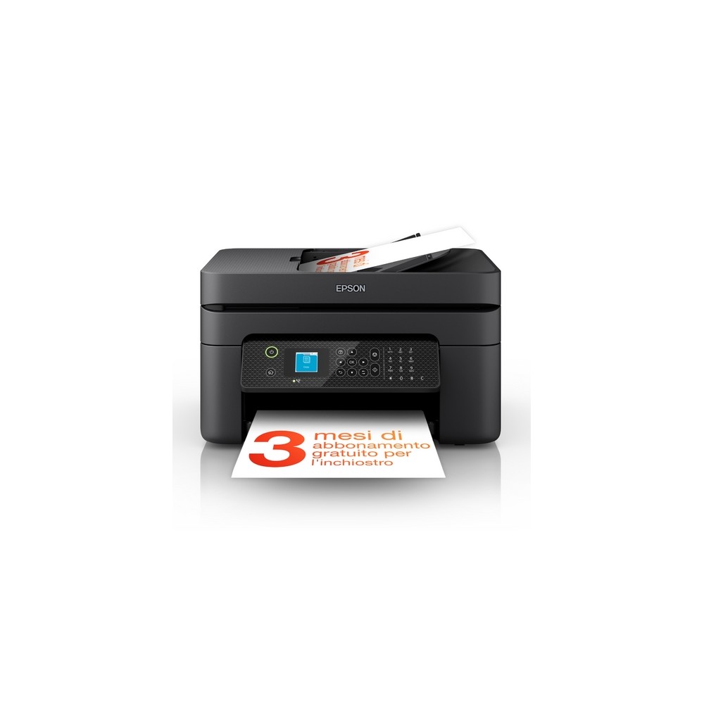 Epson WorkForce WF-2930DWF stampante multifunzione A4 getto d'inchiostro (stampa, scansione, copia), display LCD 3.7cm, ADF, WiFi Direct, 3 mesi di inchiostro incluso con ReadyPrint. Tecnologia di stampa: Ad inchiostro, Stampa: Stampa a colori, Risoluzione massima: 5760 x 1440 DPI, Velocità di stampa (colore, qualità normale, A4/US Letter): 18 ppm. Copia: Copia a colori. Scansione: Scansione a colori, Risoluzione di scansione ottica: 1200 x 2400 DPI. Fax: Fax a colori. Funzione duplex: Stampa. Massimo formato carta serie ISO A: A4. Wi-Fi. Stampa diretta. Colore del prodotto: Nero