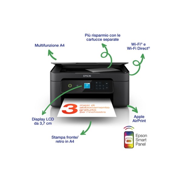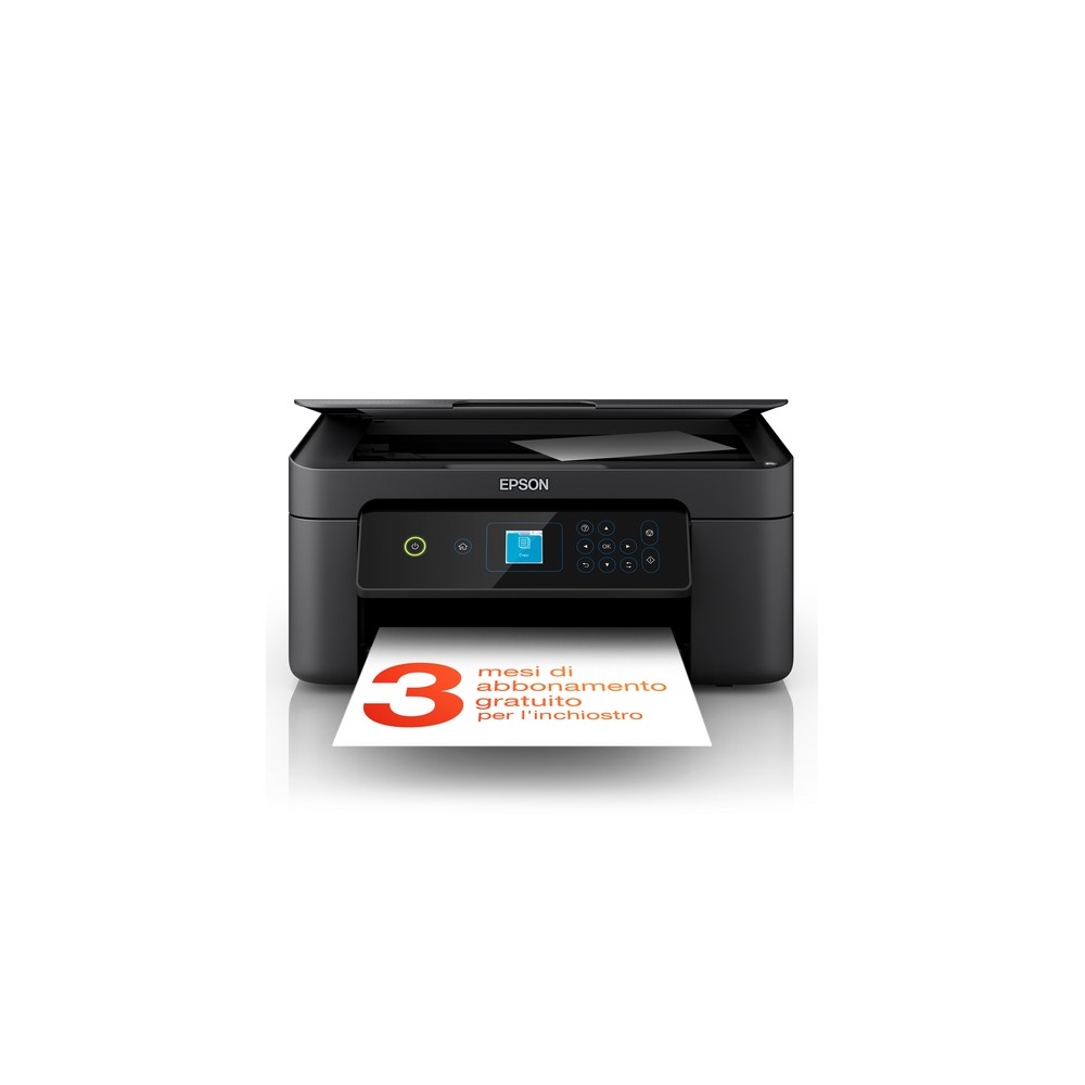 Epson Expression Home XP-3205 stampante multifunzione A4 getto d'inchiostro, stampa, copia, scansione, Display LCD 3.7cm, WiFi Direct, Stampa mobile, 3 mesi di inchiostro incluso con ReadyPrint. Tecnologia di stampa: Ad inchiostro, Stampa: Stampa a colori, Risoluzione massima: 5760 x 1440 DPI, Velocità di stampa (colore, qualità normale, A4/US Letter): 5 ppm. Scansione: Scansione a colori, Risoluzione di scansione ottica: 1200 x 2400 DPI. Funzione duplex: Stampa, Scansione. Massimo formato carta serie ISO A: A4. Wi-Fi. Colore del prodotto: Nero