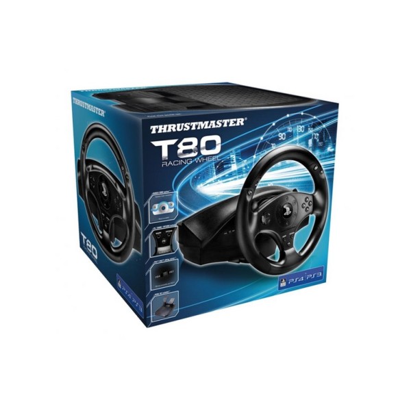Thrustmaster T80. Tipo di dispositivo: Sterzo + Pedali, Piattaforme di gioco supportate: Playstation 3,PlayStation 4, Tasti funzione per il controllo del gioco: D-pad. Tecnologia di connessione: Cablato, Interfaccia dispositivo: USB. Colore del prodotto: Nero. Tipo di imballo: Scatola