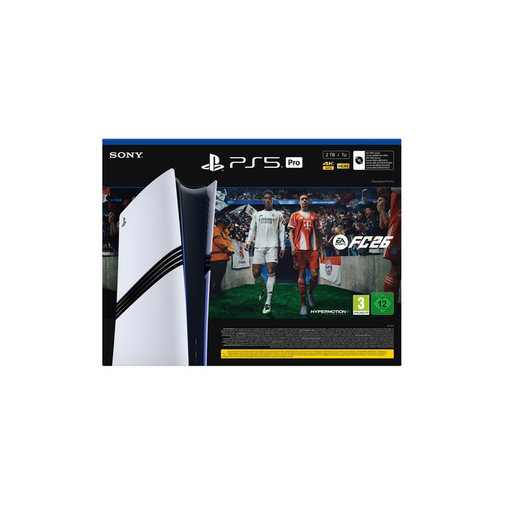Sony PlayStation 5 Pro + EA Sports FC 26 Bundle. Piattaforma: PlayStation 5 Pro, Colore del prodotto: Nero, Bianco, Tipo di RAM: GDDR6. Supporto di memoria: SSD, Capacità memoria interna: 2 TB. Velocità trasferimento Ethernet LAN: 10,100,1000 Mbit/s, Tipo di interfaccia Ethernet: Fast Ethernet, Gigabit Ethernet, Standard Wi-Fi: 802.11a, 802.11b, 802.11g, Wi-Fi 4 (802.11n), Wi-Fi 5 (802.11ac), Wi-Fi 6 (802.11ax), Wi-Fi 7.... Tipologia HD: 8K Ultra HD. Alimentazione: AC